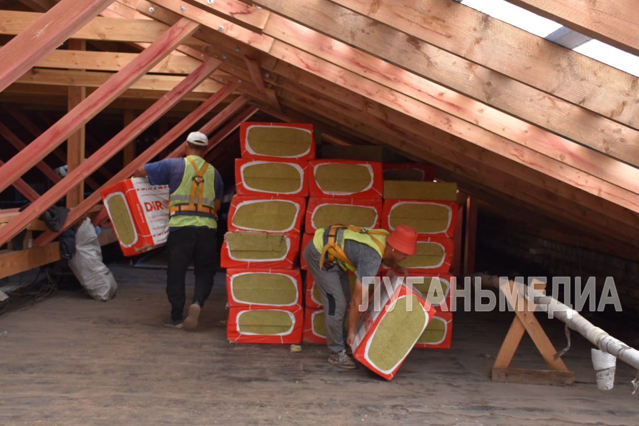 Ранее специалисты произвели демонтаж старого утепления, выровняли плиту кровли цементно-песчаной смесью, наплавили паро-влагоизоляционный материал, разобрали старый скелет кровли и установили новый, обработанный огнебиозащитным составом, затем занялись укладкой шифера. Теперь настал последний этап работ – утепление кровли.