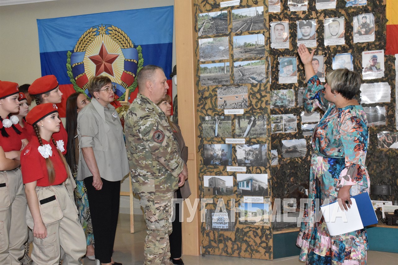 На открытие обновленного экспозиционного зала пришли председатель Совета Антрацитовского м. о. Виктория Сошина, заместитель главы Администрации округа Наталья Шаталова, депутат, координатор проекта «Историческая память», участник СВО Александр Линьков, заслуженный мастер ЛНР Александр Ткаленко, а также школьники-юнармейцы.