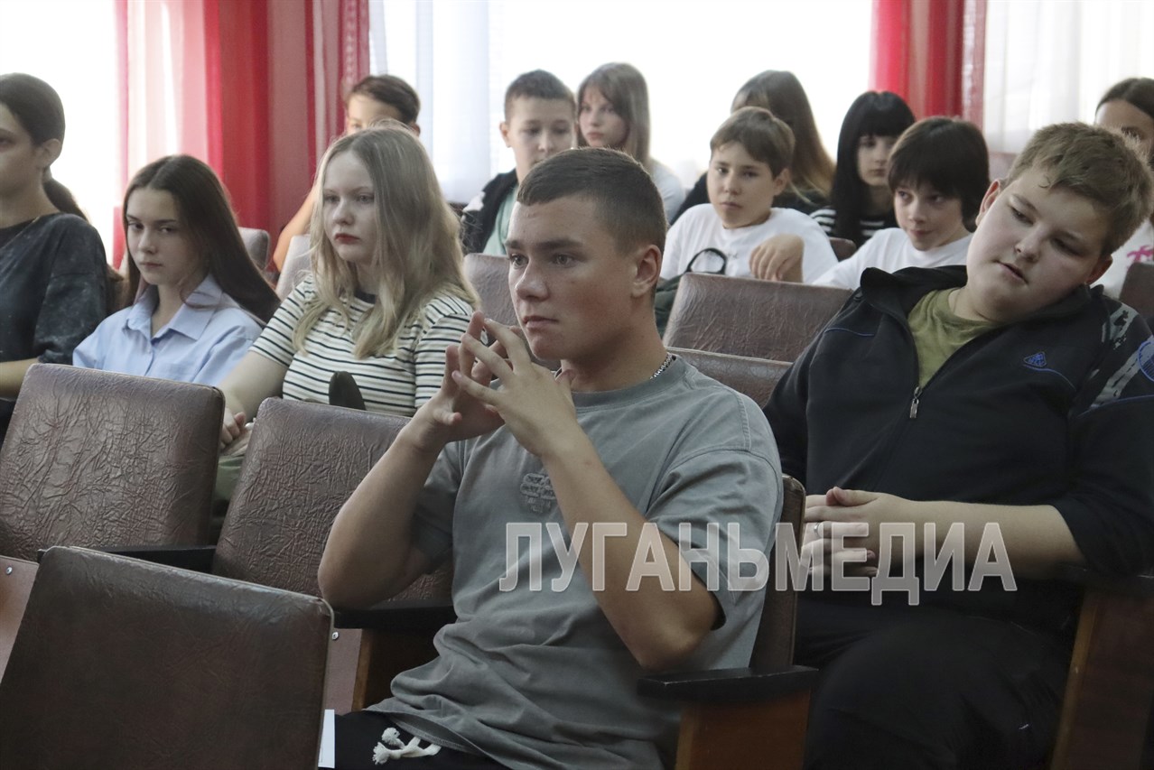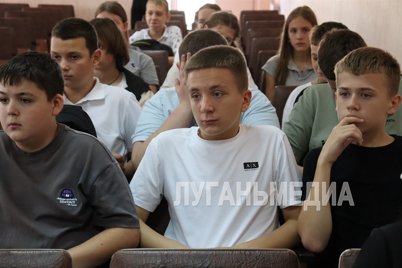 В начале мероприятия ученикам Свердловского лицея № 1 раздали памятки по минной безопасности. Врач-методист кабинета санитарного просвещения СВЦГМБ Валентина Корп представила ребятам почетного гостя встречи.