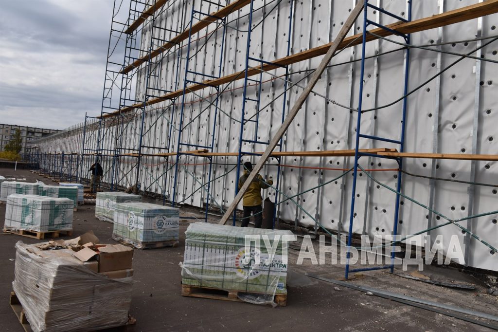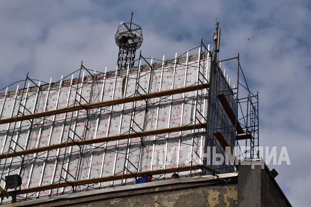 – Сейчас работы ведутся на отметке 14 и 24 метра. Идет установка вентфасада, а дальше будет уложена керамогранитная плитка. После проведения верхних работ будет заменена кровля по всему периметру здания. А потом опустимся вниз, чтобы сделать главный и боковой фасады. Концепция площади предусматривает новые решения, поэтому на месте мозаики будет керамогранит и будет установлен экран и проектор, чтобы демонстрировать фильмы и все остальное. Работа запланирована на два года. Сейчас – первый этап. Как только будет установлена плитка, специалисты проведут полный ремонт кровли, чтобы сделать, как говорится, на века, – подчеркнул Александр Антоненко.