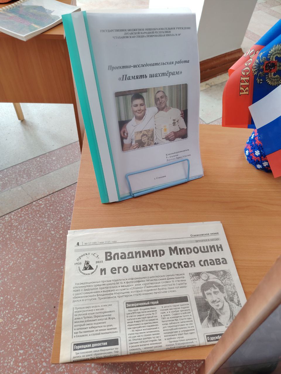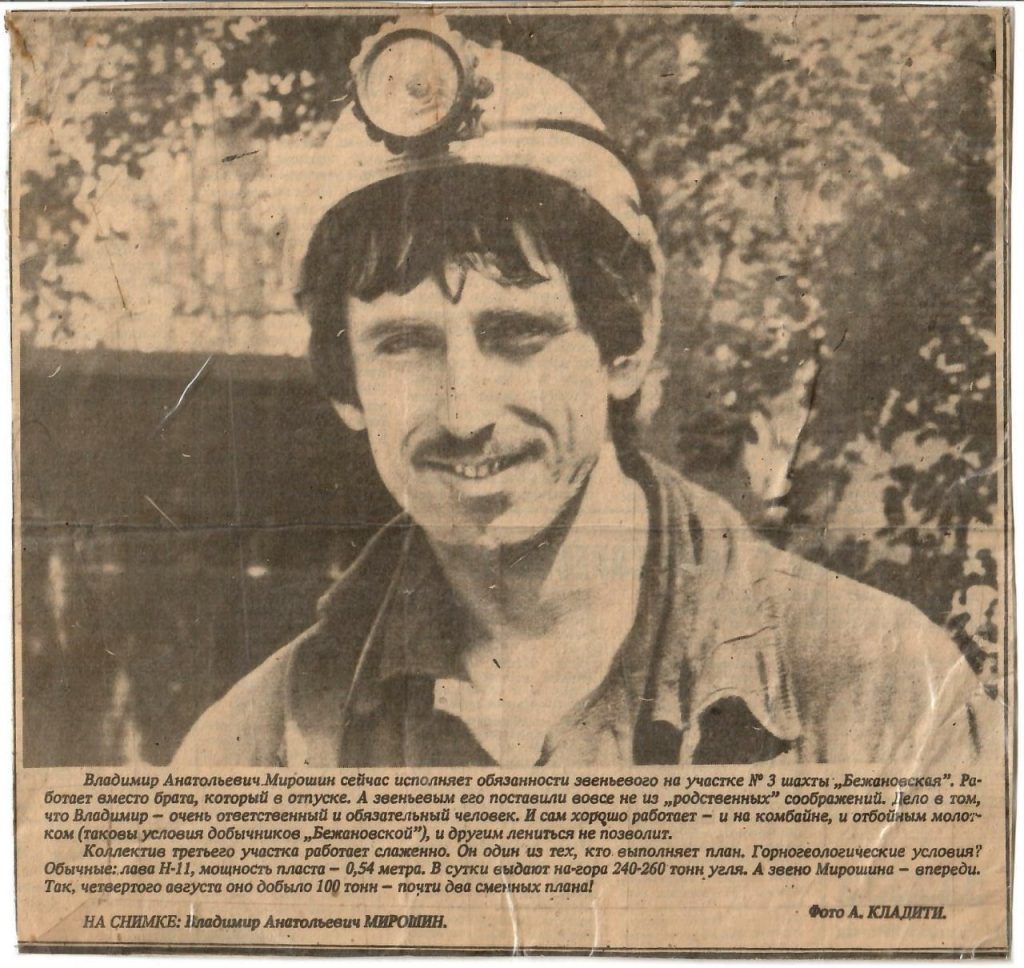 На редакционный призыв поделиться информацией о шахтерских семьях первой откликнулась специализированная школа № 10. К фотографиям пятиклассника Димы Шанталова с дедушкой прилагались и вещдоки: знак «Шахтерская слава» III степени с удостоверением и вырезка из газеты «Сбойка» о звеньевом участка № 3 шахты «Бежановской» Владимире Мирошине, который подменял брата, пока тот находился в отпуске. Признаемся, триггером стало именно печатное слово.