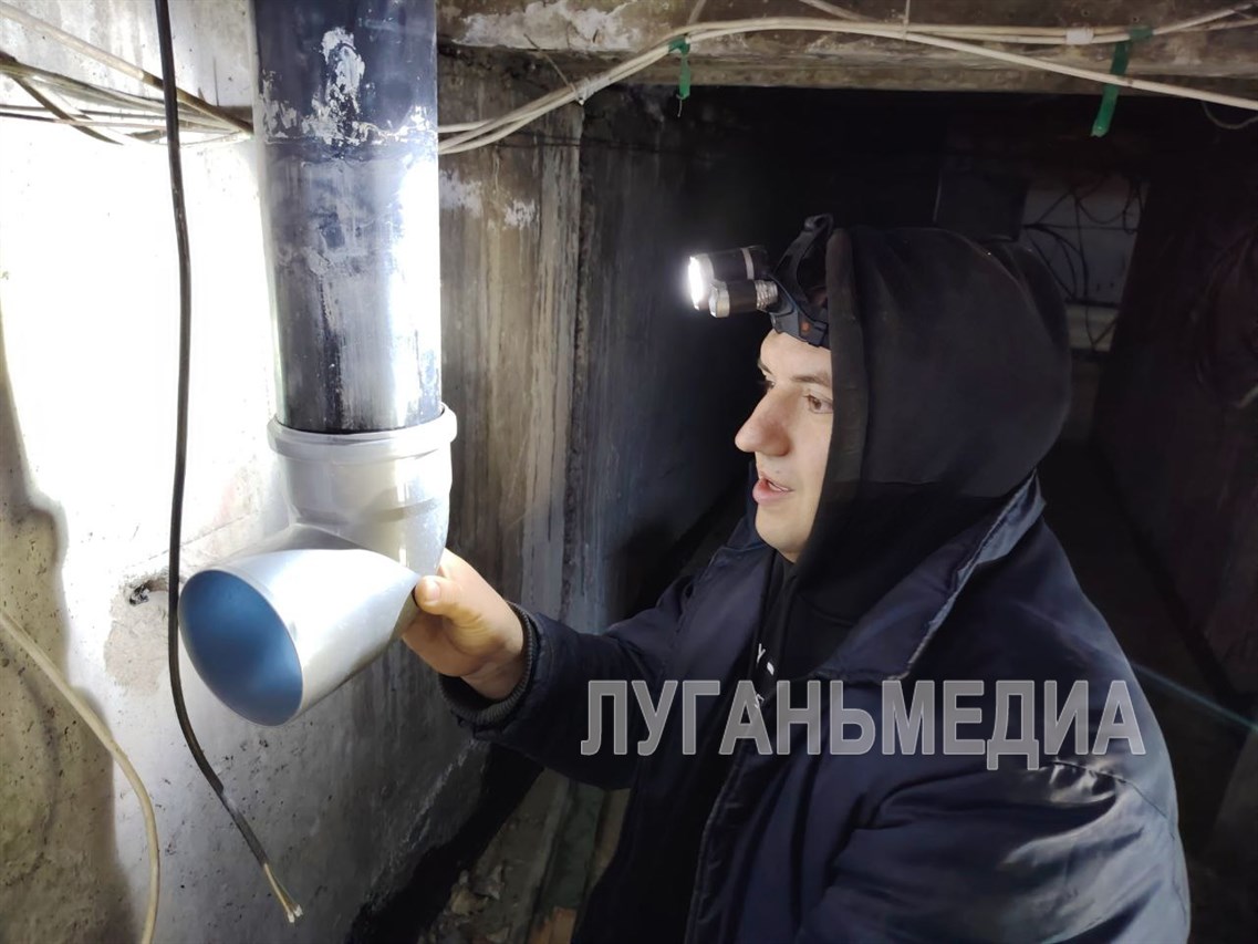 Сотрудники Стахановского филиала ЕУК работают по замене ливневой канализации в одном из подъездов дома №1 по улице Олимпийской.