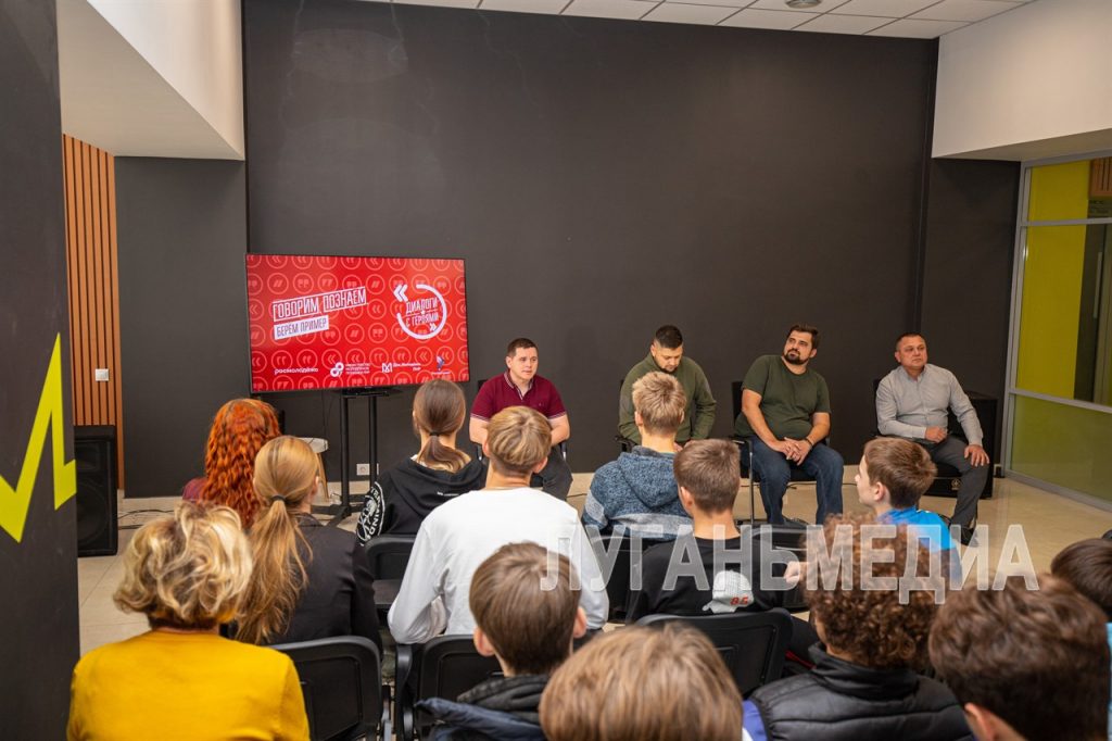 Ко Дню отца в рамках проекта «Диалоги с Героями» и при содействии Министерства спорта ЛНР в Молодежном центре «Квартира» состоялась встреча школьников с участниками специальной военной операции – молодыми отцами, символами мужества и силы нашей страны.