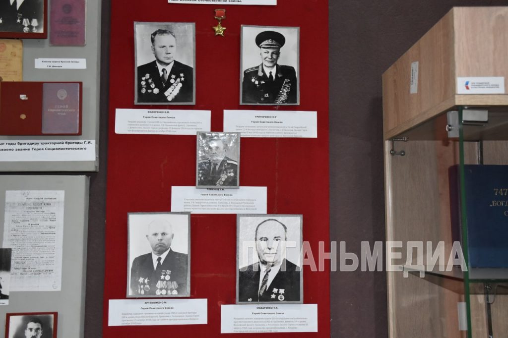 На следующем стенде посетители могут увидеть фотографии земляков, которые были удостоены звания Героя Советского Союза. Это Александр Артеменко, Василий Федоренко, Егор Левенец, Михаил Григоренко, Тимофей Макаренко. За героизм и мужество, проявленные во время Великой Отечественной войны, они удостоены самой высокой награды – медали «Золотая Звезда».