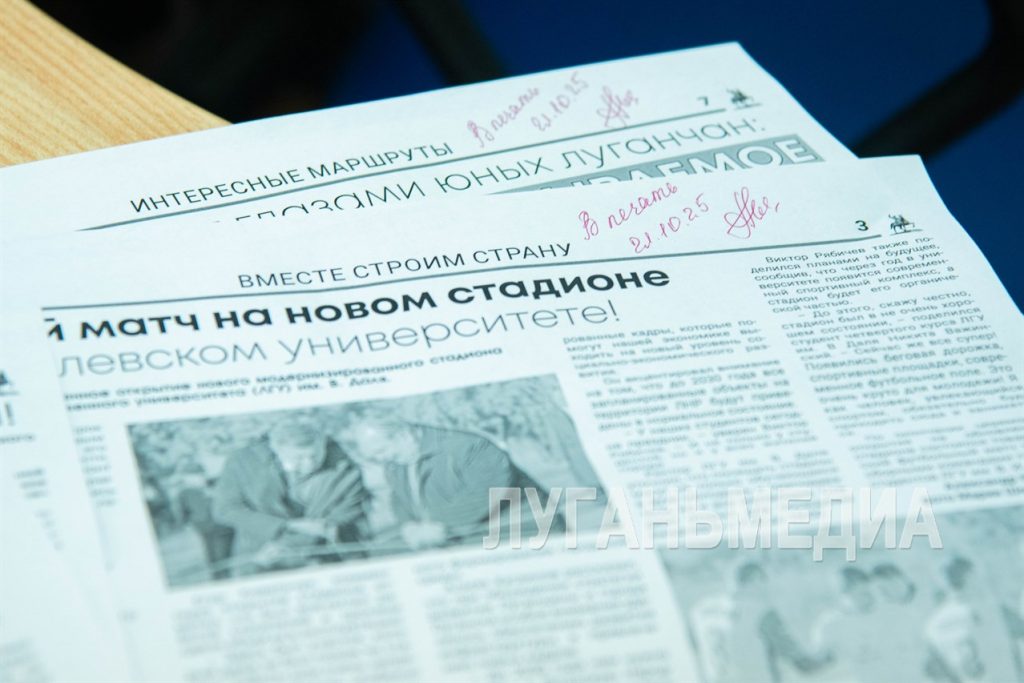 В редакции издания для молодых талантов прошел увлекательный мастер-класс по журналистике. Директор ГУП ЛНР «ЛУГАНЬМЕДИА» Татьяна Юрьевна Кутя вместе с творческим коллективом газеты провела экскурсию по предприятию и мастер-класс для участников детской студии кино-, телеискусства «Синема» Луганского центра детско-юношеского творчества «Гармония». Мастер-класс был насыщенным и интересным. Ребята узнали о всех этапах создания газеты: от поиска темы до написания яркой и информативной статьи и ее публикации.