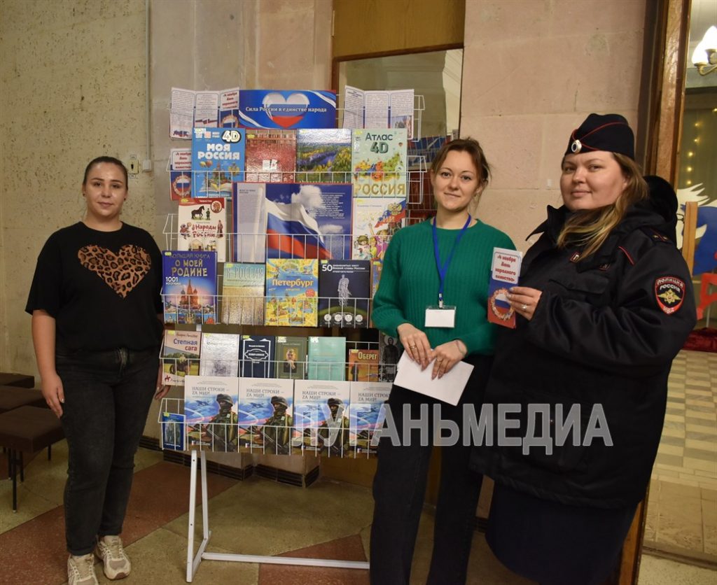 Библиотека также внесла свой вклад в праздничное мероприятие, подготовив тематическую выставку «Сила России в единстве народа».