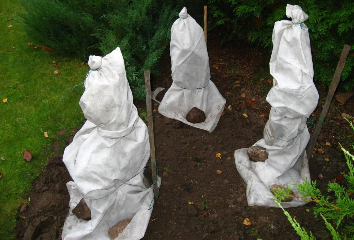 Ткань легко укладывается на растения и крепится к земле с помощью камней или специальных скоб. Весной, после окончания заморозков, агроволокно следует снять с растений.