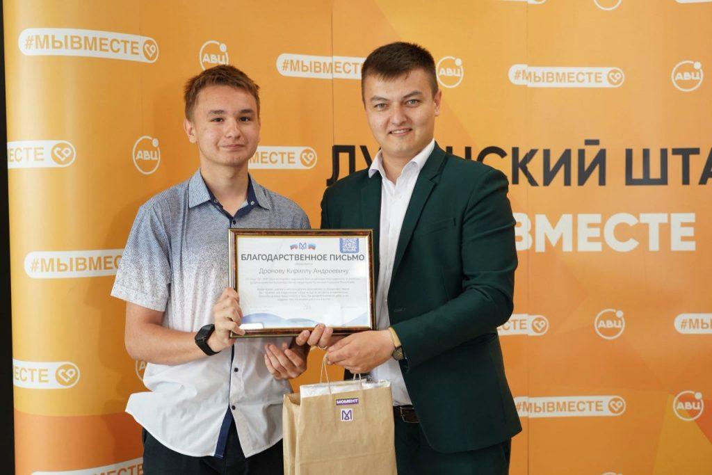 Активная позиция Кирилла и готовность помогать другим людям не осталась незамеченной. Свидетельством признания его заслуг стали благодарственные письма от Дома молодежи и Администрации города Луганска.